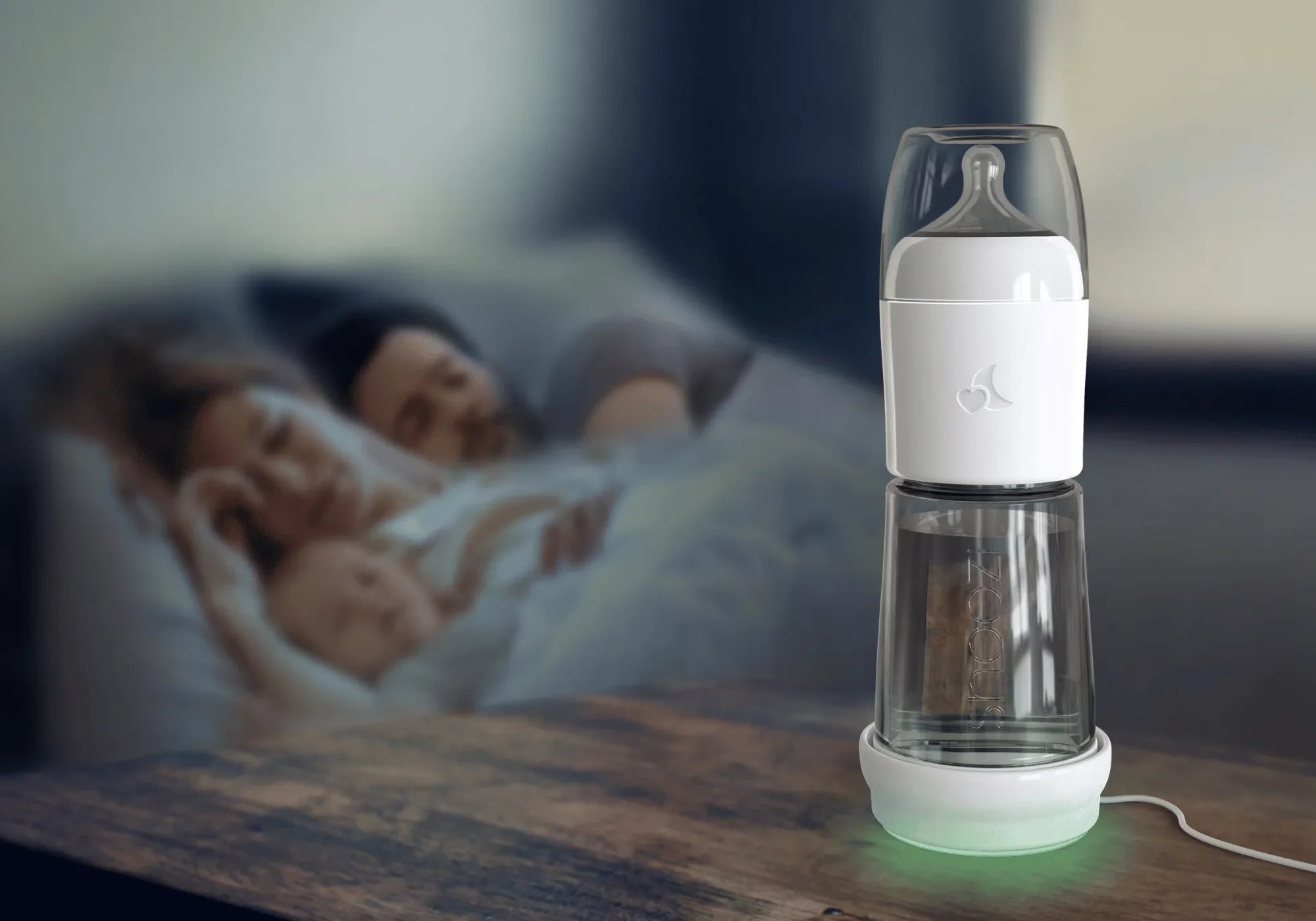 The Pre-portioned milk powder is kept dry and separately from the water in the Snoozi night bottle. Only the water is kept constantly warm at 37°C/99°F (body temperature). At night everything is mixed with one hand when necessary.