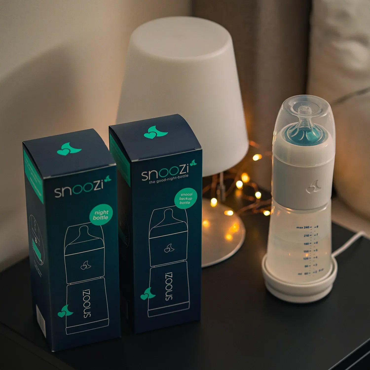The Pre-portioned milk powder is kept dry and separately from the water in the Snoozi night bottle. Only the water is kept constantly warm at 37°C/99°F (body temperature). At night everything is mixed with one hand when necessary.